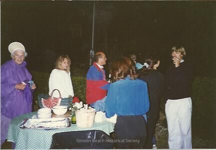 At an outdoor evening party Peggy Pepper in a purple poncho and white brim hat looks at the camera while she stands beside a buffet table with assorted dishes on it. There is a small crowd of people either talking to each other or looking at the table. Web Otis in blue and red windbreaker stands in the center. Guy Schwering, in black & white and holding a cigarette, stands on the right talking to a pony-tailed woman in a dark suit.Collection