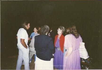 At an evening event Carol Wagner, in red sweater and purple dress, and Roger Hurt, in white t-shirt and pale trousers, converse with assorted people.Collection