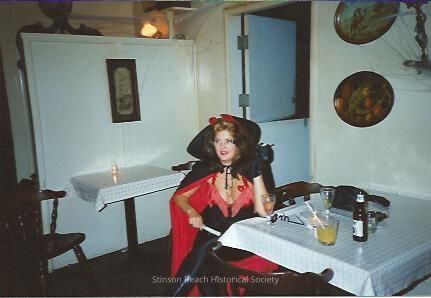 On Halloween 1992, Pema Schwering is seated at a table at the Sand Dollar Restaurant wearing a low-cut black dress with red trim and red-lined black cape and black hat with red horns. The covered table has a couple of cocktail glasses and a beer bottle on it. The Dutch door behind her is open, top half more than bottom. And there are framed paintings on the walls.Collection