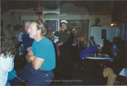 On Halloween 1992, Bob Boyce with his arms crossed sits at the bar at the Sand Dollar. He's wearing an aqua t-shirt. Behind him at the bar stands Don Palmer. At the far end, barely visible, is Marcus White. Standing in the center in a sailor suit is Mez Mezara. Various people are standing and seated in the background.Collection