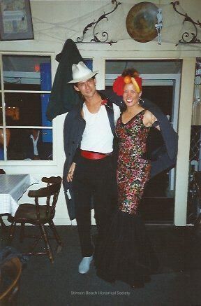 On Halloween 1992, Toby Bisson & Mary Greenwood pose at the entrance of the Sand Dollar Restaurant. She has a Carmen Miranda look in a colorful, low-cut and slinky floral print dress with a red head wrap decorated with fruit. Toby is a Zoot suiter in black & white with red cumberbund, blue shoes and white fedora.Collection