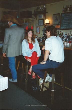 On Halloween 1992, Debbie Nepil sits at the bar facing an unidentified male. She has a light blue flouncy jacket over her red outfit. She also is wearing red strappy shoes and horns on her head. Her legs are crossed, her hands resting on the bar stool. Behind her with his back to the camera is Charlie Lenhoff in a large cowboy hat, gray jacket & jeans. An array of liquor bottles is lined up behind the bar (and on the wall along with framed memorabilia)Collection