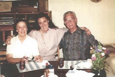 Dr. Knox Finley with his wife Mary Lee and daughter Milbourne between them, with he arms around each of them, sit around a table. The table is set with two placemats with glass tumblers, condiments in the center and a bouquet of flowers on the right. Mary, in a white blouse, holds her eyeglasses in her hands. Knox wears a dark plaid shirt, Milbourne a light checked shirt and pearl necklace.Collection