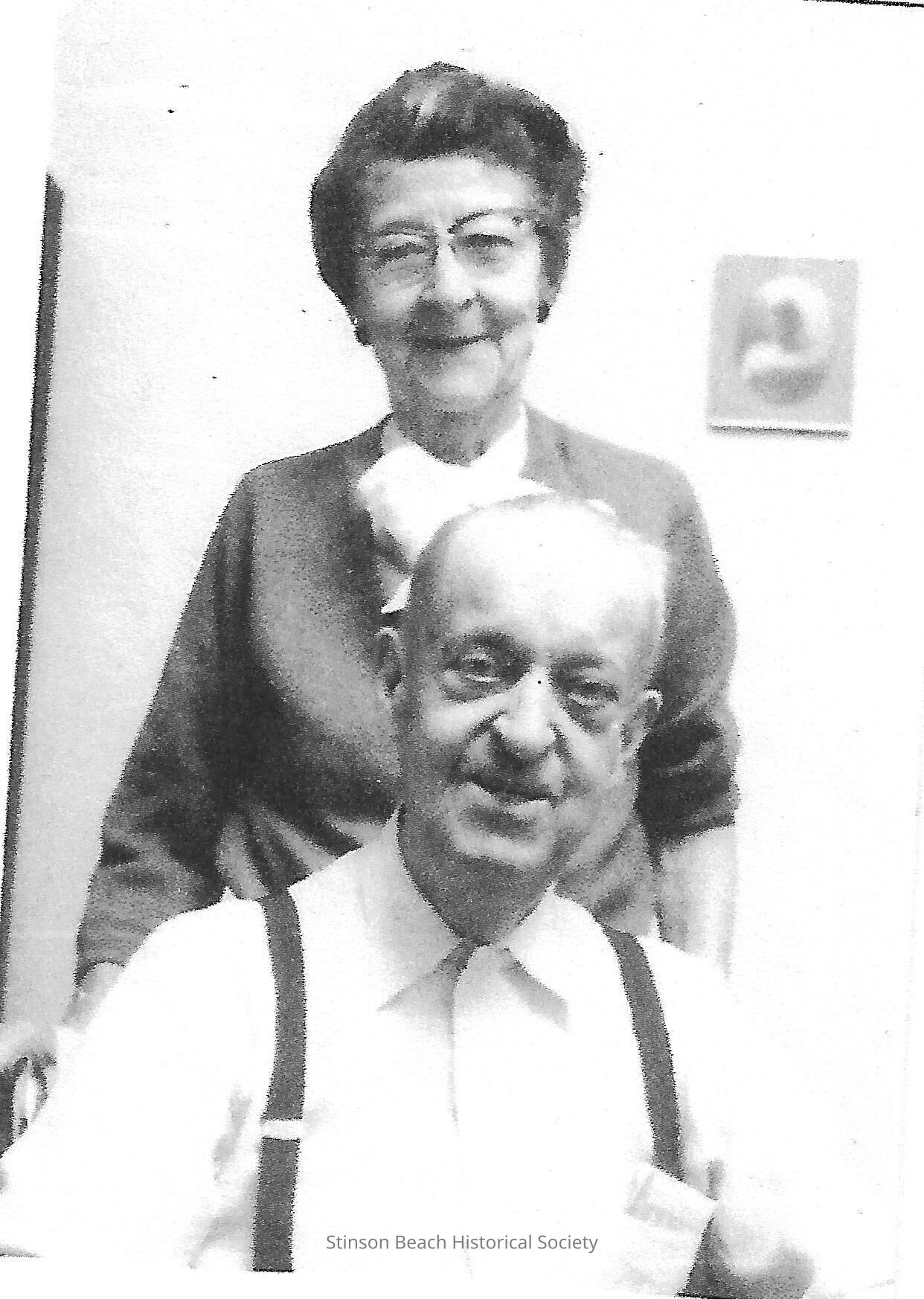Dr. Paul Carter and his wife Lota, grandparents of Milbourne Finley, lived in Stinson Beach from the early 1950s until the late 1970s. Here Lota stands behind Paul who is seated. He has on a white shirt with dark suspenders. She has on a cardigan over a white blouse. There is one small picture on the wall behind themCollection