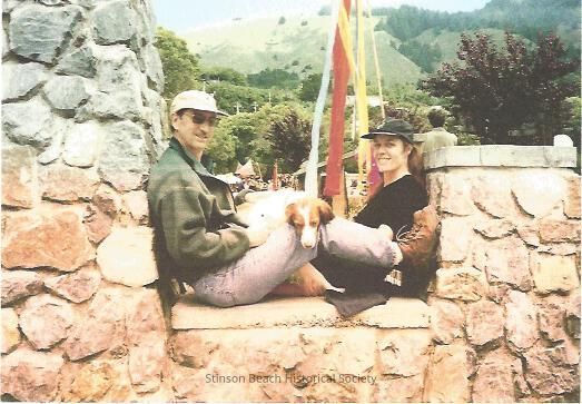 Milbourne and her husband Tom Mowery sit in the stone wall entrance to the Village Green across from the Parkside. They are both wearing caps - his white, hers black. Their dog Penny pushes her head between their legs. A colorful banner shows in the background and the crowds attending Cuisine on the Green further in the distance. Green hillside is backdrop.Collection