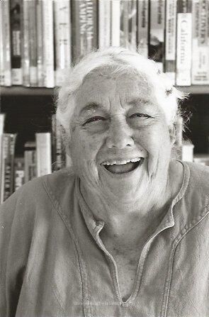 Longtime resident, former teacher and library volunteer Nancy Sullivan laughs at the camera while she sits in front of shelves of books in the library. She has white hair, pulled back, and is wearing an open-neck denim shirt.Collection