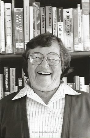 Longtime resident, former member of the SBHS Board and library volunteer Shirley Moyce smiles broadly at the camera in front of shelves of books in the library. She has short dark hair, wears round glasses, a dark cardigan over a white blouse.Collection