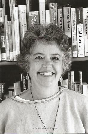 While she lived in Stinson, Sally Veauta spent many years interviewing long-time local residents for the SBHS living history archives. One of the many library volunteers she poses in front of shelves of books. She has short wavy salt & pepper hair and is wearing a light-colored boat-neck sweater with a long necklace and round dangly earrings.Collection