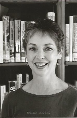 Despite suffering from multiple sclerosis Valerie Houlihan spent many active hours as library volunteer as well as digitizer for the SBHS archives. Here she poses in front of shelves of books wearing a dark boat-neck sweater with dainty drop earrings. She has dark hair worn in a pixie cut.Collection