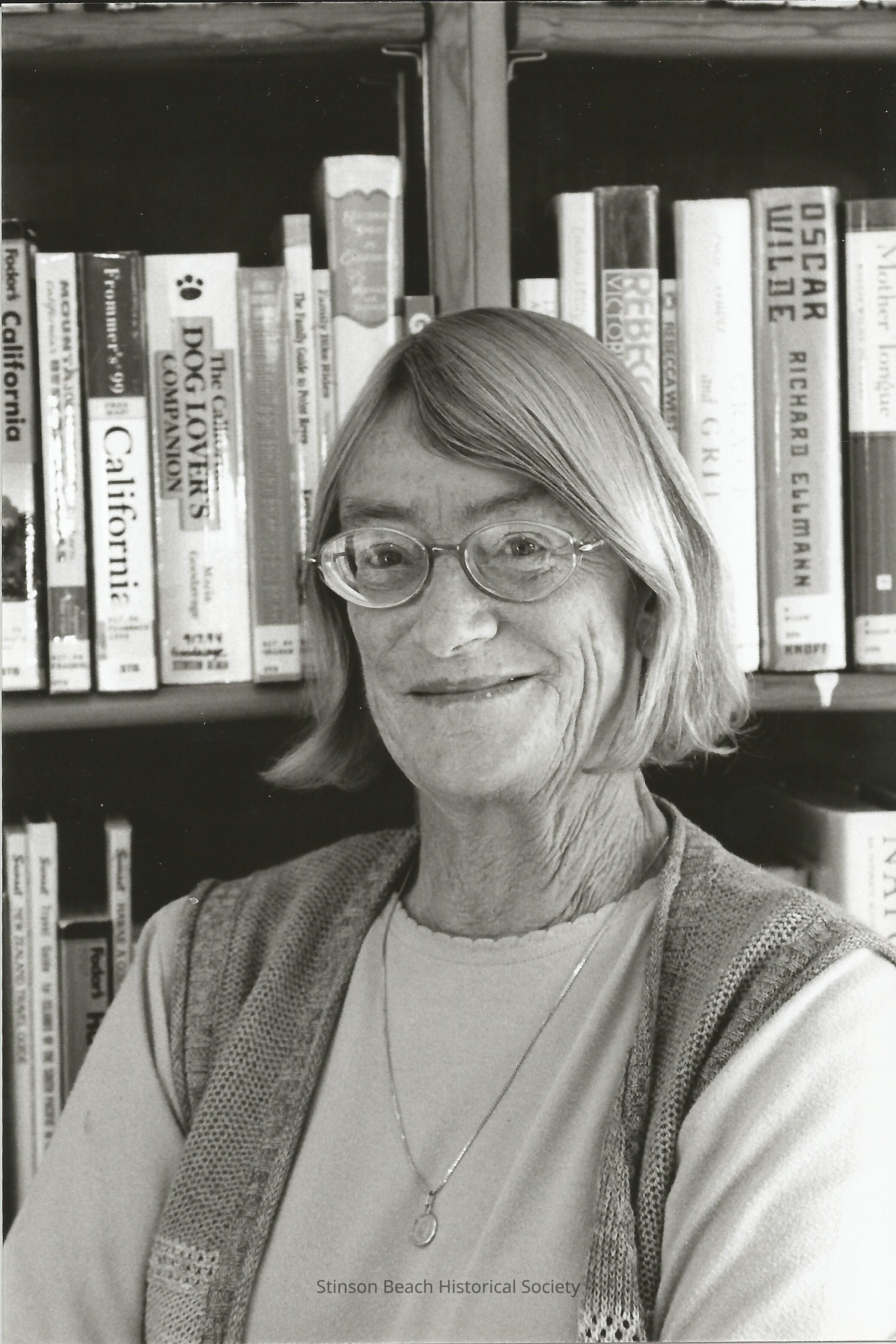 Unfortunately no one came remember this volunteer's name but she was appreciated nonetheless. She has chin-length rather straight hair parted on the side and wears glasses. Standing in front of shelves of books, she is wearing a wool vest over a white shirt and a small necklace.Collection