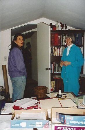 Kerry Livingston and Jane Slack stand behind a table piled with papers and file boxes. There is an open door between them where a couple of people can be seen in shadow. There is a shelf of books behind them with model horses on the top. Kerry is standing sideways looking back at the camera. She's dressed in a lavender jacket & jeans. Jane is smiling at the camera and wears a turquoise outfit with a white turtleneck.Collection