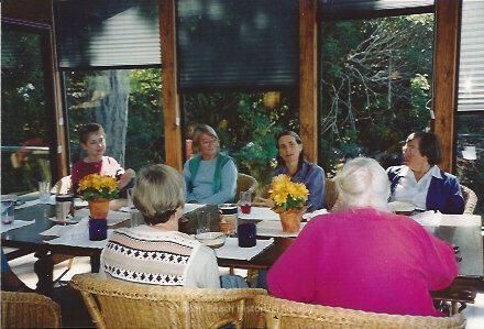 Gathered around the lunch table are (L to R) Valerie Houlihan, unidentified woman, Kerry Livingston and Shirley Moyce. Seen from the back are Phyllis Fitzpatrick, in Scandinavian print vest, and Nancy Sullivan in pink. Kerry seems to be speaking and the others are focused on her. There are two potted plants with yellow flowers on the table and assorted glassware. The floor to ceiling glass window forms the backdrop through which is seen dense vegetation. The location is Jane Slack's house.Collection