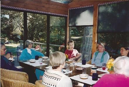 From a different angle, those gathered around the lunch table are (L to R) Hillary Lorraine, Jane Slack at the head, Valerie Houlihan, unidentified woman and Kerry Livingston. Seen from the back are Phyllis Fitzpatrick and Nancy Sullivan in pink. Eyes are still focused on Kerry. There are two potted plants with yellow flowers on the table and assorted glassware. More of the outdoor garden at Jane's house can be seen through the floor to ceiling glass window. There are venetian-type blinds on the two of the windows.Collection