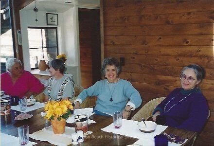 Seated along the lunch table are (L to R) Nancy Sullivan and Phyllis Fitzpatrick in deep conversation, and Sally Veauta and Hillary Lorraine smiling graciously at the camera. There is a knotty pine wall behind them while a window and white counter with assorted objects on it, plus a black & white wall clock, is visible behind Nancy & Phyllis. The table has a few leftover dishes and glassware (plus the yellow plant) on it.Collection