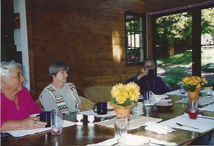 At the table are (L to R) Nancy Sullivan, Phyllis Fitzpatrick and Hillary Lorraine, who is taking a sip from her cup. There are white placemats on the table, a few clear glasses, some with red liquid and ice in them, and the yellow potted plants. The backdrop is a knotty pine wall on one side and floor-to-ceiling glass window/door on the other displaying a garden of lush green foliage.Collection