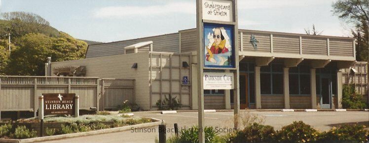 Panoramic view of the new Stinson Beach Library prior to opening. A bit of free advertising for Shakespeare at Stinson and the Parkside Cafe whose sign holds centerstage. A wooden Stinson Beach Library sign is posted in front of the courtyard fence with an Egret logo. There is also a blue Pelican sculpture on the wall over the library entrance.Collection