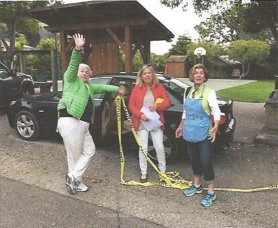 Three women stand in the road in front of Village Green I (L ro R): Sandra Francis with one arm raised in greeting and the other resting on the open car door behind her while holding on to a long yellow caution tape . She is wearing a lime green quilted jacket and white trousers and tennis shoes with one leg is crossed in front of the other. Wendy Di Paolo (center) has on a red jacket over light colored jeans and shirt and black flats. She is holding some papers in her hands and something yellow in the crook of her arm. Ginny Otis, with her arms at her side, wears a blue apron over her chartreuse vest and white shirt with slight rolled up jeans and blue tennies. In addition to the black car behind them, the wooden bus shelter is visible and an empty Village Green basketball court & lawn. Presumably this is prior to Cuisine set up.Collection