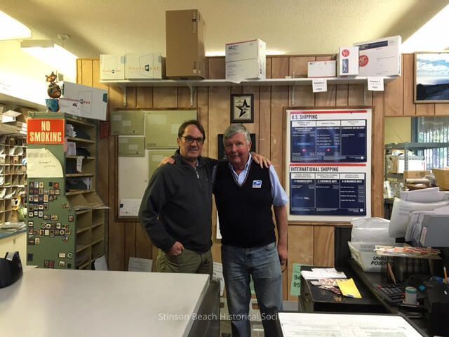Postmaster James Harvey stands beside longtime Postal Clerk Mark White. They are inside the Stinson Beach Post Office and each has an arm around the other's shoulder.Collection