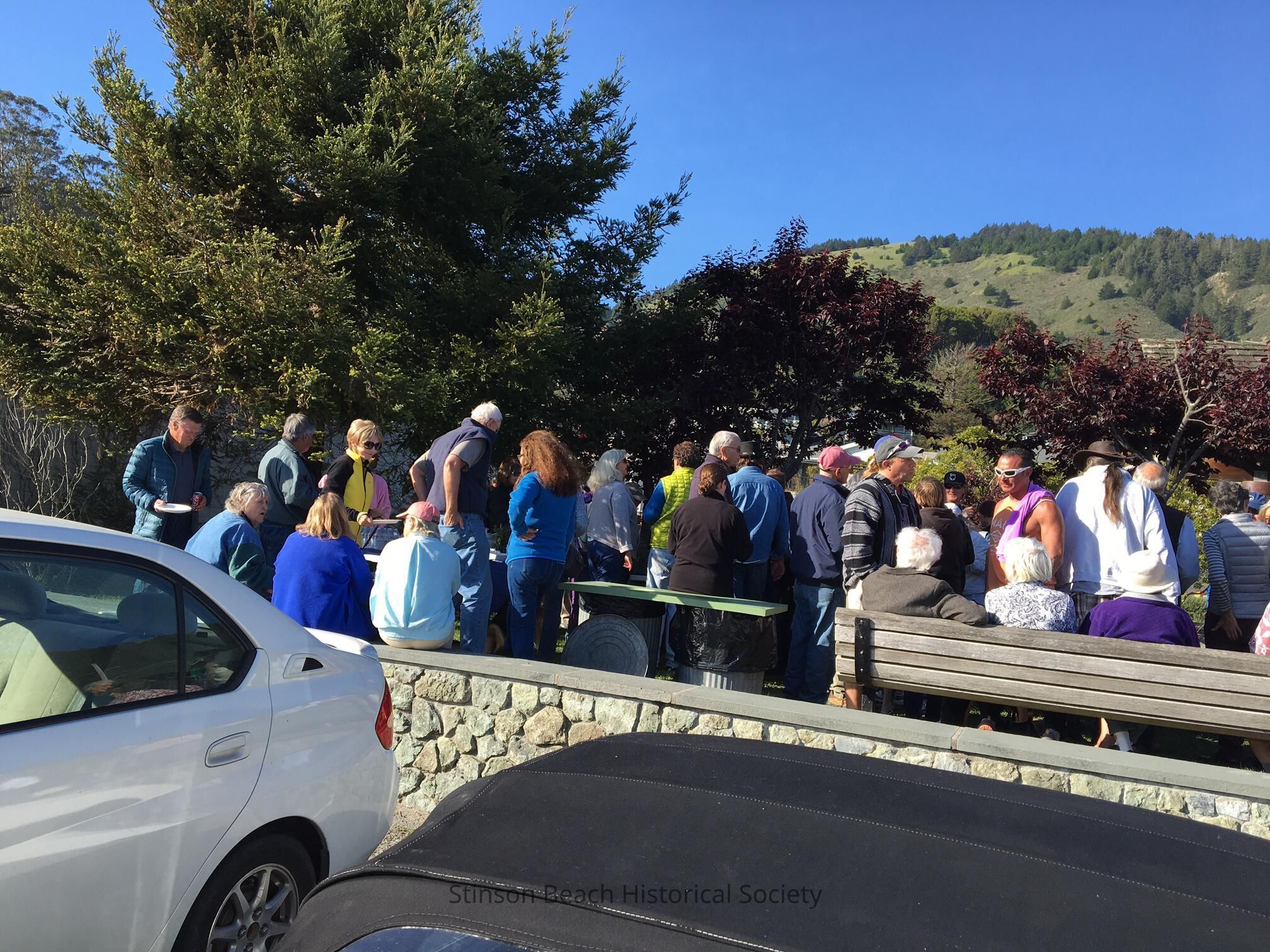 Second photo of the crowd of people attending the Post Office's 100th Anniversary Party at the Village Green II. Photo shows more cars in the parking lot.Collection