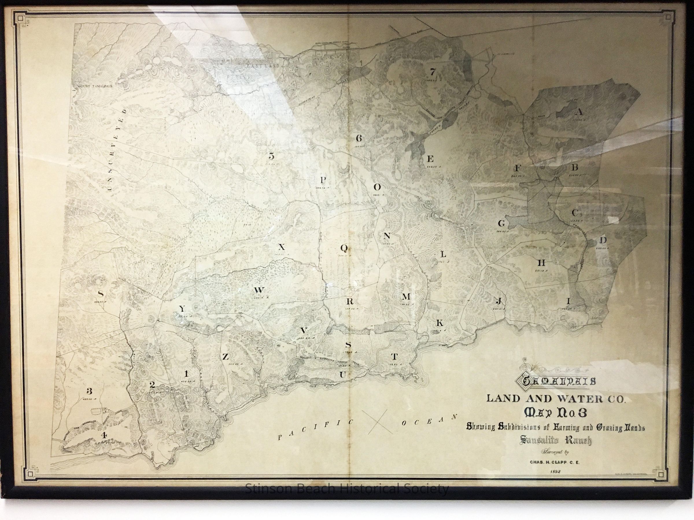 This is a photograph taken through glass of the frame. The map of Marin County ordered by Tamalpais Land and Water Co in 1892. Its title reads "Tamalpais Land and Water Co Map No 3 Showing Subdivisions of Farming and Grazing Lands, Sousalito Ranch, Surveyed by Chas. H. Clapp C.E. 1892". It shows the Rancho Sausalito divided into 34 ranches, named a to z and 1 to 8.Collection