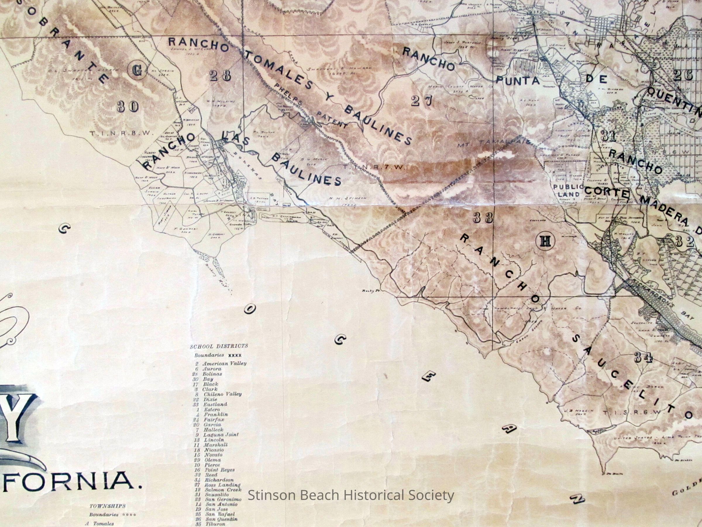 This is a portion of map titled "Official Map of California, 1892; compiled from Record and Survey by George M. Dodge C.E belonging to Bolinas Museum. This shows Rancho Baulines, portions of Rancho Tamales Y Baulines and Rancho Saucelito, Rancho Corte Madera. It includes besides the topographic land features, land owners names and their holdings by acreage.Collection