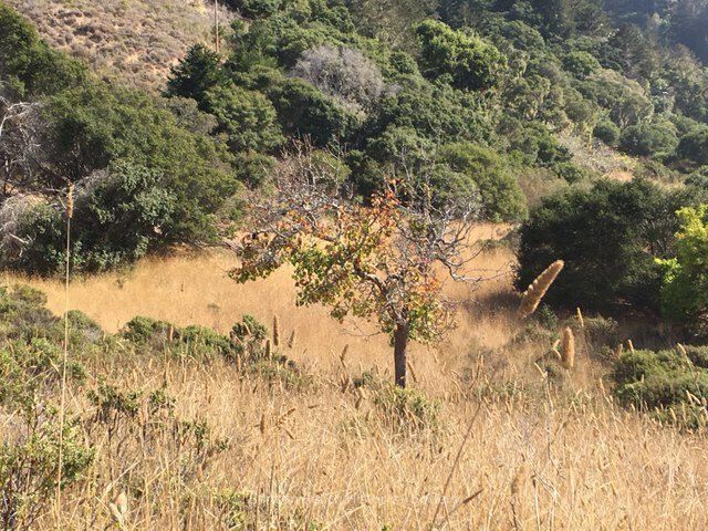 This is a digital photo of a fruit tree standing on the hillside field of the old Stinson Ranch. It is planted on the hill but near a watery spot with nearby grasses still green in September. It is very small, about 8 feet tall with spread of 5 feet or so. The leaves indicate some fruit like an apricot.Collection
