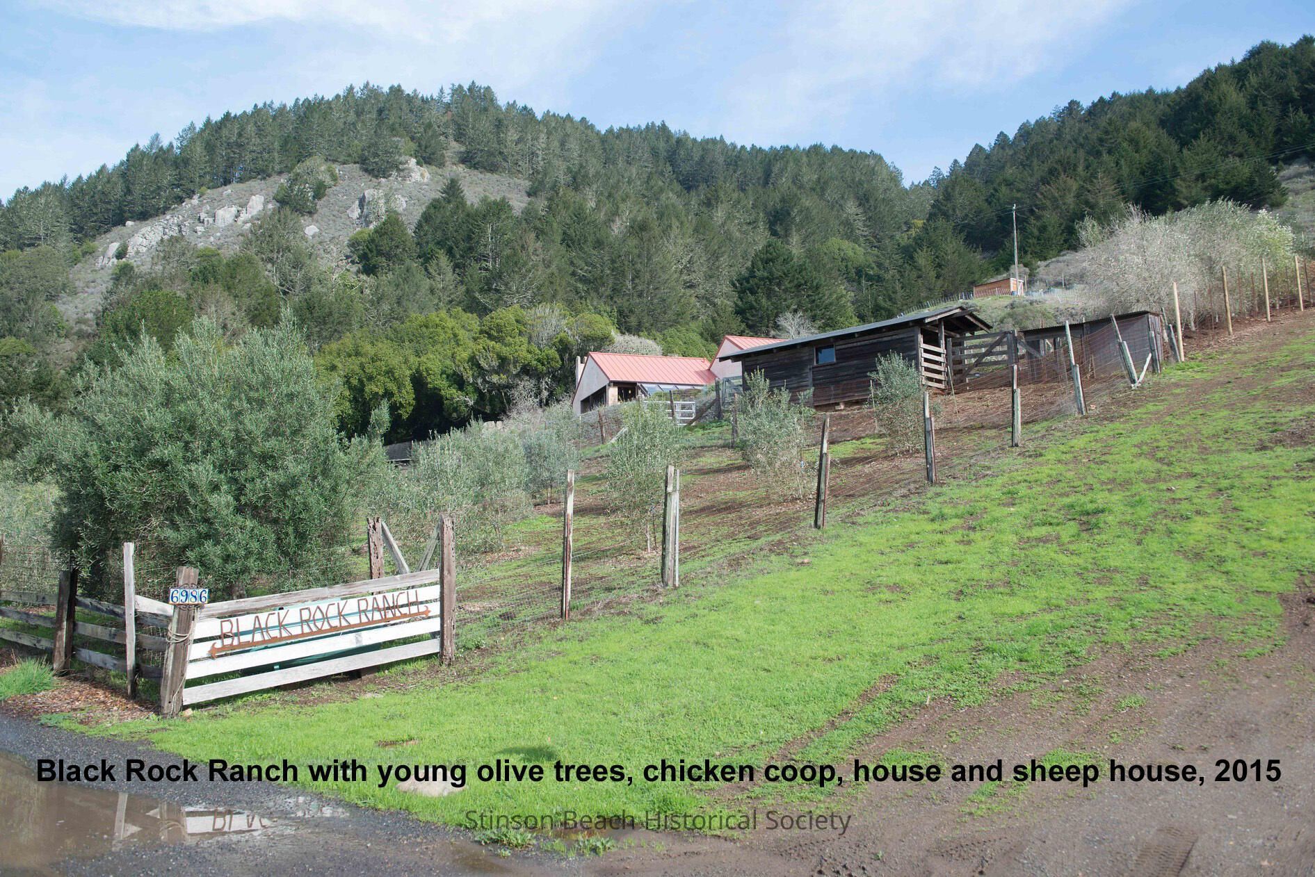 This is a photo of the 3-1/2 acre Black Rock Ranch on the Panoramic Highway. It shows their gate with Black Rock Ranch spelled out in iron on a wooden gate fronting a field going uphill. It shows newly planted olive trees, the house on left, chicken coop to right and the sheep shed at the top of hill.Collection