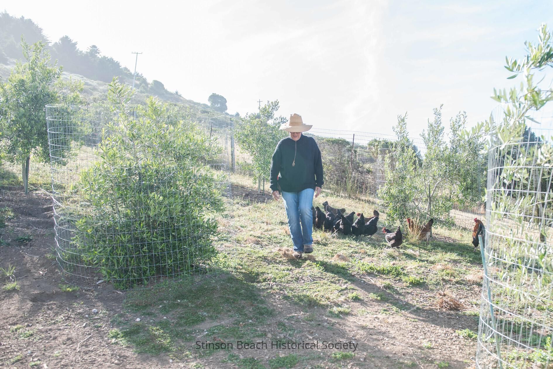 This is a digital image of the Black Rock Ranch on Panoramic highway. The small 3-1/2 acre ranch was established around 2010 by Sandra and Robert Guidi. It is mainly an olive ranch but they sell eggs and keep sheep for wool. The photo shows Sandra Guidi with her chickens among her olive trees.Collection