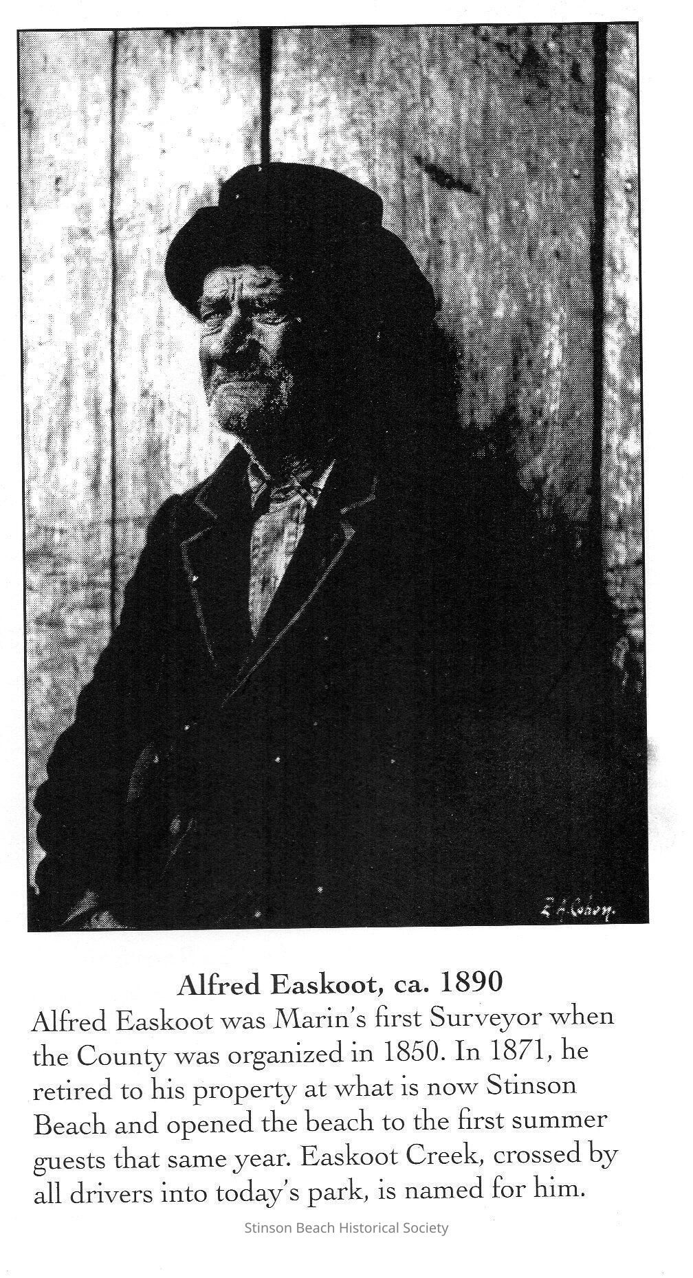 This is a digital photo taken from page 233 of a book titled "Marin A History" written by Barry Spitz published in 2006. The black and white old photo shows Alfred Easkoot, ca1890. In 1850, he became the Marin County's first surveyor as well as the first man to start the tent resort in Stinson Beach in 1871. The photo shows an older man with a brimmed hat against vertical board fence or house wall. He is wearing a dark colored jacket or overcoat and buttoned shirt without tie. His weathered face is grimaced looking toward the sun. The photograph is signed E.A.Cohen on lower right. The photographer Cohen took many photos of Stinson Beach during the turn of century.Collection