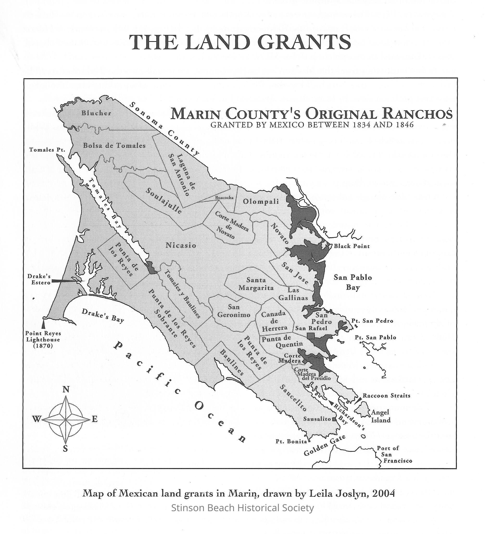 This is a digital photograph of page 20 of the book Marin A History by Barry Spitz published in 2006 showing Marin County's original ranchos granted by Mexico including Rancho Baulines where Stinson Beach was established. The map is titled "Marin County's Original Ranchos: Granted By Mexico Between 1834 And 1846".Collection