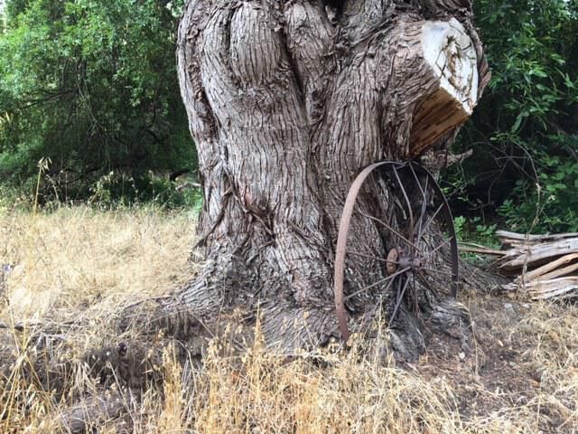 This is a digital photo of a hay-lake wheel left leaning against a Cypress tree so long ago that the tree trunk has grown around it. The tree stands in front of the old ranch hands' house at old Stinson Ranch which was razed by GGNRA in the 1990s. The last tenants were the family of Fred and Gloria Conradi. They had 2 grown sons and 1 daughter when they were required to move.Collection