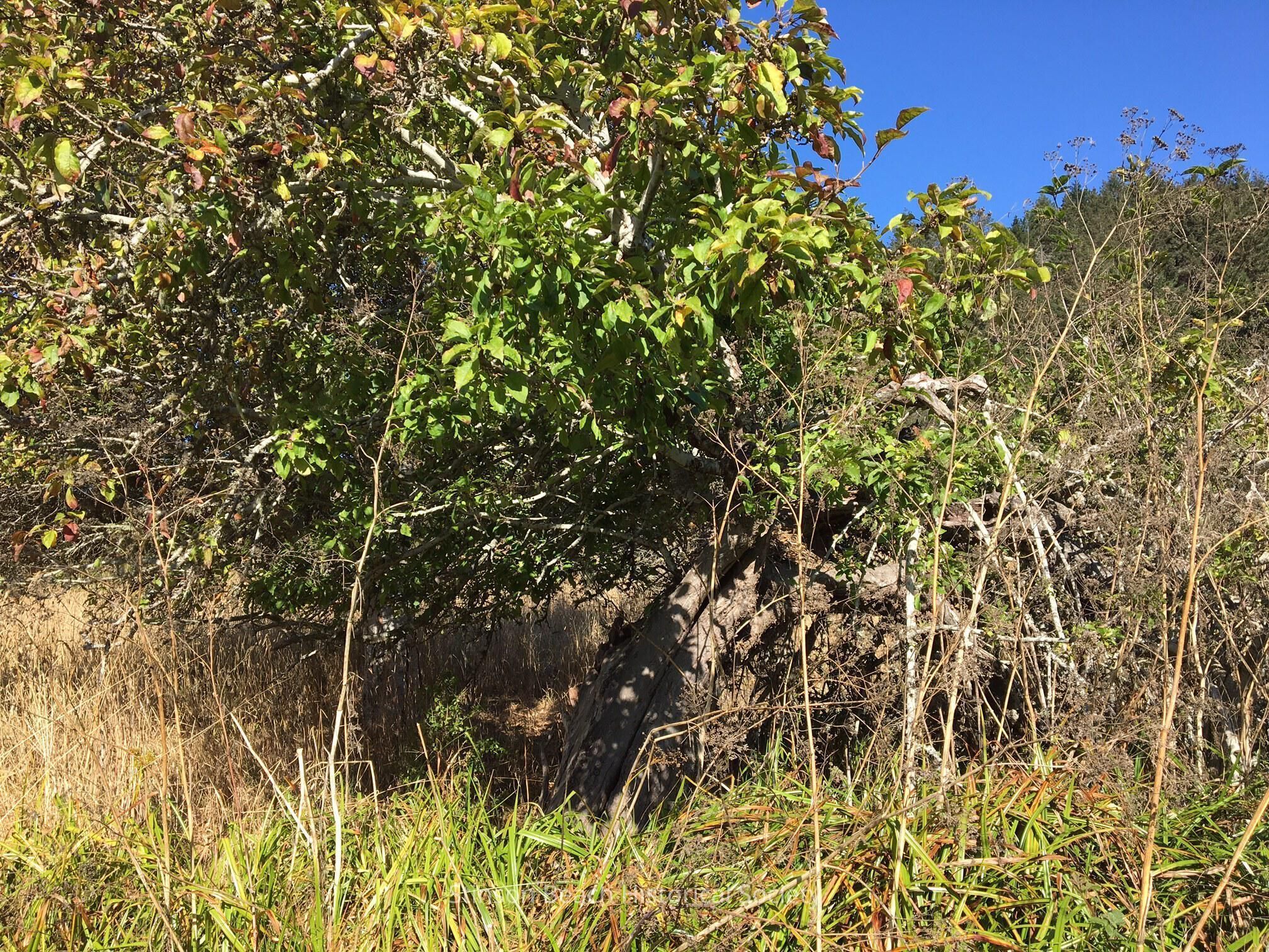 This is a digital photo of one of the old apple trees in Old Stinson Ranch now belonging to GGNRA. This one grows near the stream and the broken trunk and a half of tree is almost dead. it is listing toward the stream and had large squareish fruit with green skin with red-orange brush which is closer to pippin apple. It is growing among tall grasses.Collection