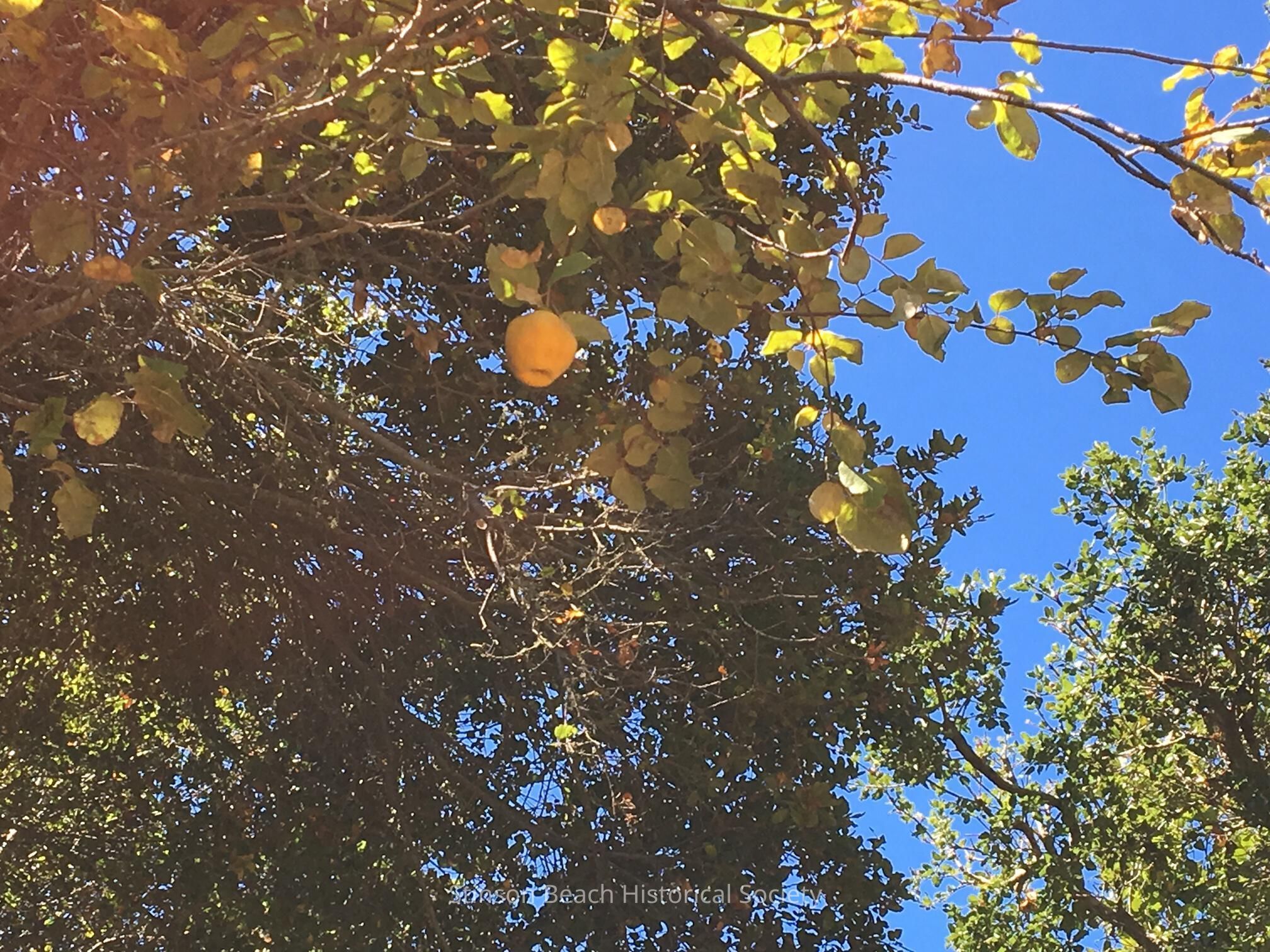 This is a digital photo of branches of tall quince tree with its fruit growing near the old Stinson Ranch barn. There are a few fruits on these branches - the center one is ripe yellow. The light green quince leaves are visible against dark live oak tree branches beyond and blue sky.Collection