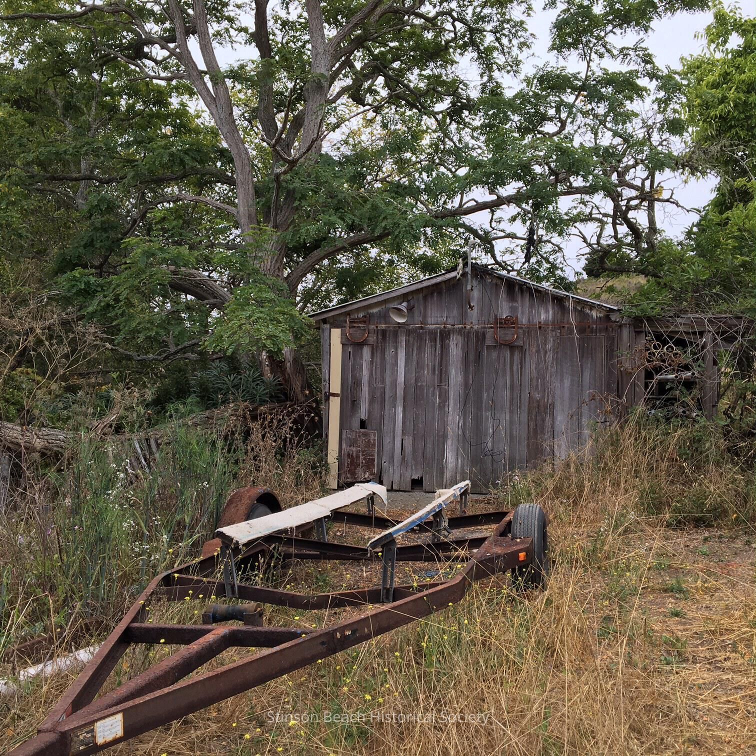 This is a digital photo of the old work shed on the old Stinson Ranch. There is an old rusted boat trailer parked in front of it. It has weathered vertical board sidings and barn doors with a large floodlight type fixture above. It has about 14 feet wide facade.The roof is corrugated sheet metal now half rusted. the right side of the building has a wooden frame holding several pipes likely built by current occupier, SBCWD. Though the photograph does not show it, the back side of this building holds an old abandoned green Jeep with its bed filled with a giant nest of woodrats. A rusted boat trailer is parked in front of the barn doors.Collection