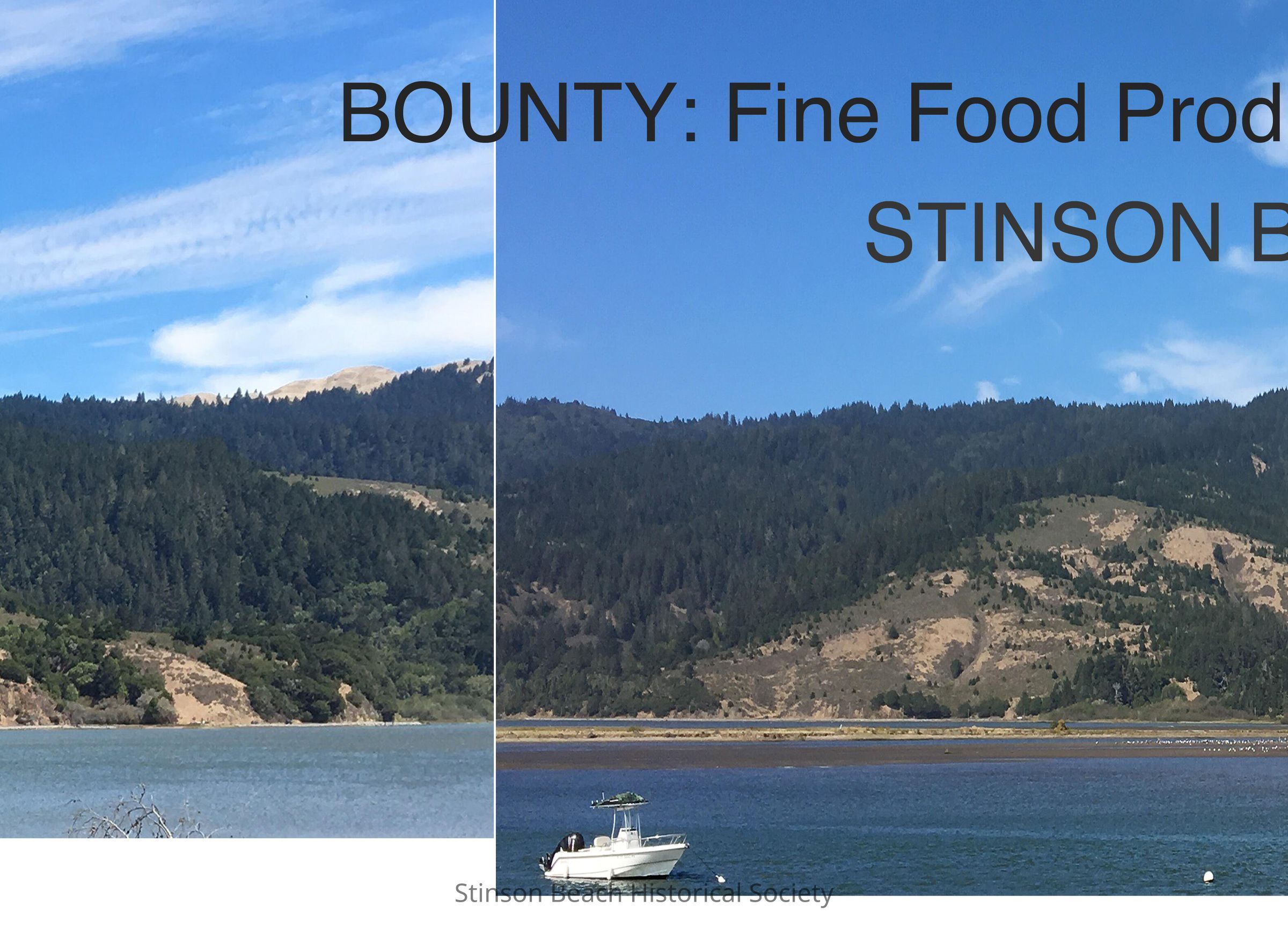 This is the 3rd from the left hand side photo used to compose the title of the show called "Bounty Celebrating Agriculture in Coastal Marin from 1834 to 21st Century: Stinson Beach Area Farms and Ranches" exhibited at the Historical Corner of Stinson Beach Library starting Oct.8, 2016. The hills shown across the Bolinas Lagoon in this photo was mainly occupied by 800-acre Morse Ranch and later Christmas Tree Ranch and present GGNRA from the shore to the ridge. The canyon behind the fishing boat was called Morse Canyon. The photo shows mostly green trees and brown summer hills , blue sky and blue lagoon.Collection