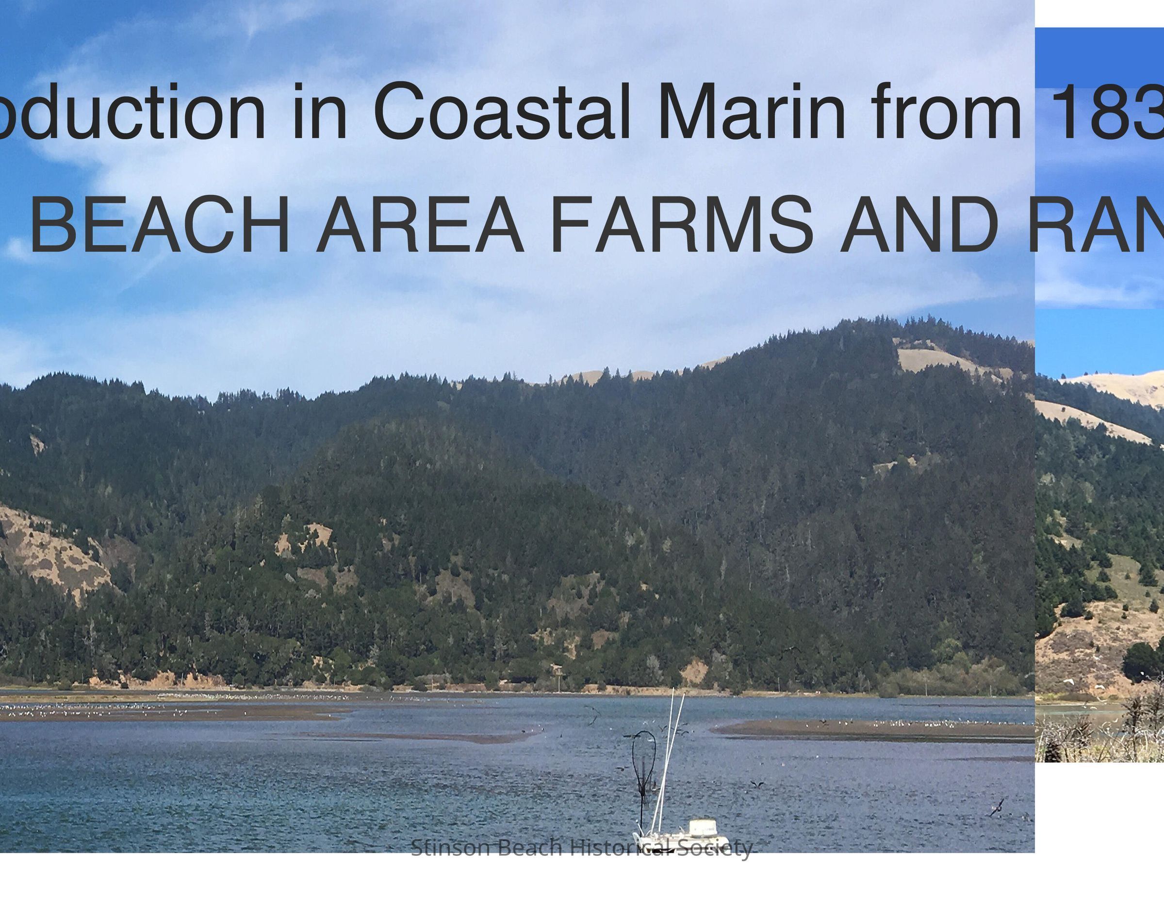 This is the 4th from left hand side photo used to compose the title of the show called "Bounty Celebrating Agriculture in Coastal Marin from 1834 to 21st Century: Stinson Beach Area Farms and Ranches" exhibited at the Historical Corner of Stinson Beach Library starting Oct.8, 2016. The lower part of hill shown across the Bolinas Lagoon behind the boat in this photo was where McKennan family had Duck farm and later known as the Landing where the ferry boat to Bolinas operated.. The photo shows mostly green trees and brown summer hills , blue sky and blue lagoon.Collection