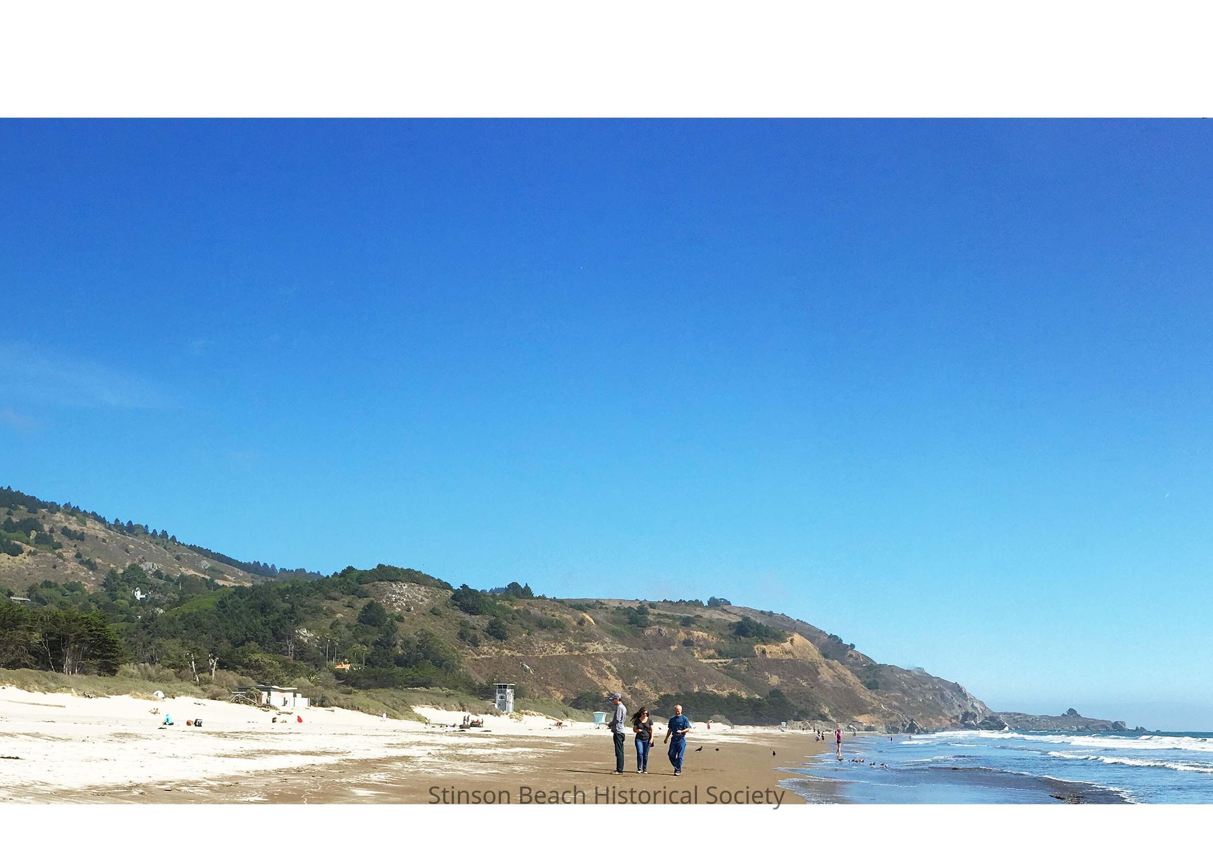 This is the very right hand side photo used to compose the title of the show called "Bounty Celebrating Agriculture in Coastal Marin from 1834 to 21st Century: Stinson Beach Area Farms and Ranches" exhibited at the Historical Corner of Stinson Beach Library starting Oct.8, 2016. The hills shown across the beach in this photo was mainly occupied by White Gate Ranch (Present GGNRA) from the shore to the ridge. For the convenience of the title the Slide Ranch was mentioned though it is not shown on this photo. It was and is exist just beyond the right of the photo. . The photo shows mostly green trees and brown summer hills , blue sky and sandy beach and blue ocean in the distance to the right.Collection