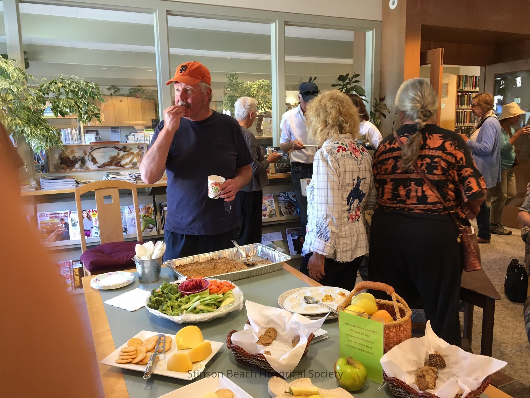 This is a digital photo taken at the opening of "Bounty" Show on Oct. 8, 2016 at Stinson Beach Library. The photo was taken centered on the food table with SBHS president, Marcus White eating. To right of him are back views of Harriet Kossman and Celeste Washington.There are 4,5 people milling around, looking at the shows and talking and eating the finger food served. There is an apple and a basket of apples on the lower right of the table that was harvested from the apple trees ( over 150 years old?) in old Stinson RanchCollection