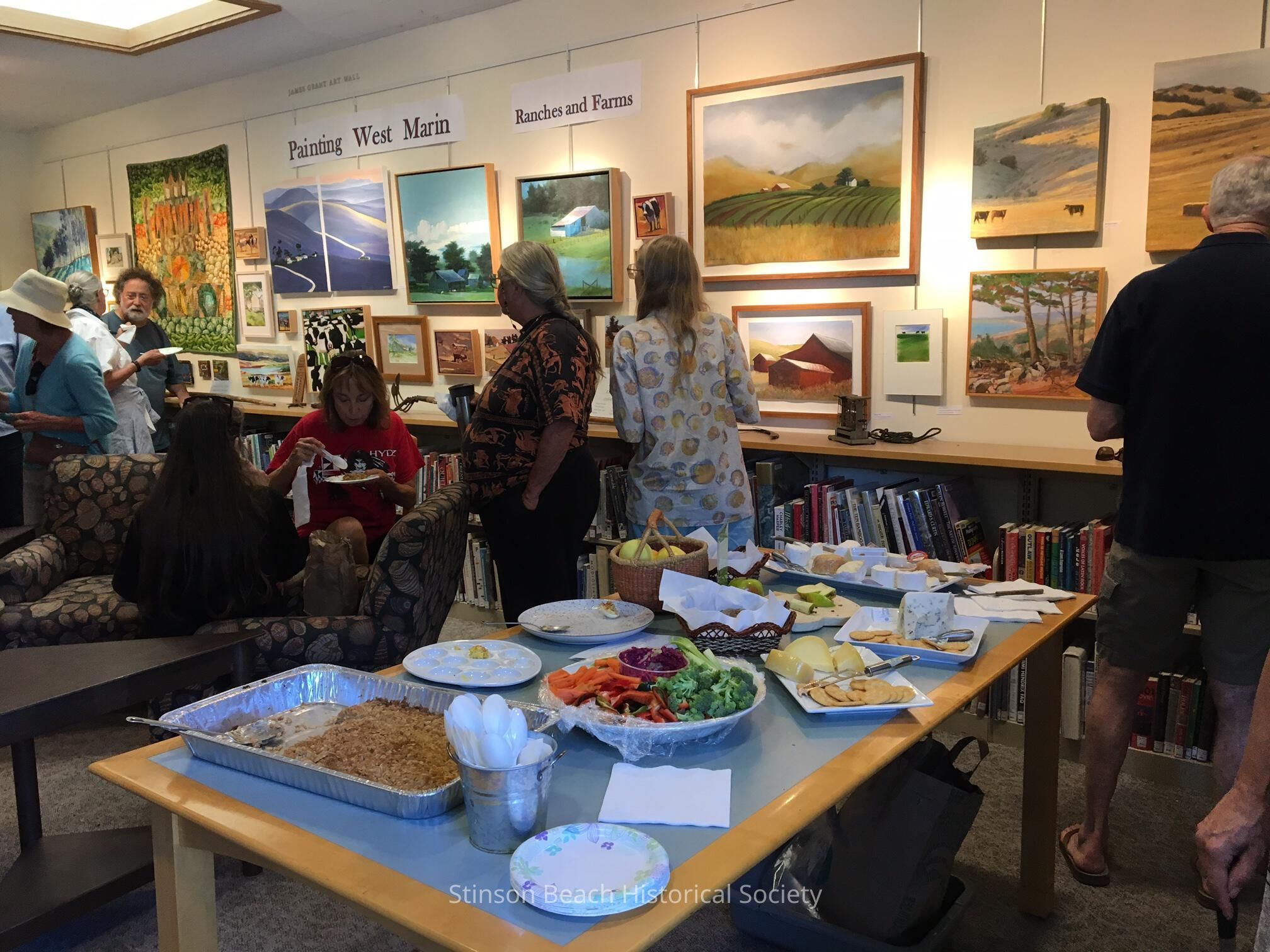 This is a digital photo from the joint opening day of "Bounty "show. The food table prepared by Catherine Broomhead of KT's Kitchen is the subject of this photo and 8 people are appreciating the art works on the Art Wall behind it. The lady in the center of the photo is Celeste Washington, the Secretary of SBHS. The food prepared are: vegetable dip, many cheeses, deviled eggs, apple crisp, all from produces and products of local farms and ranches. Apples from the old Stinson Ranch were also tasted.Collection
