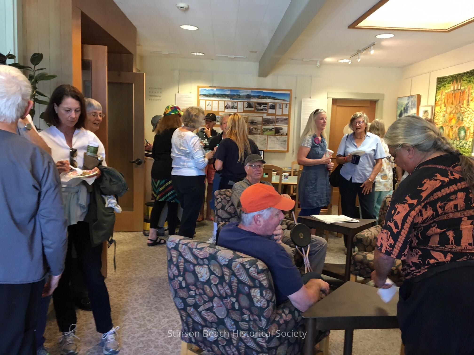 This is the photo taken on the opening reception of the joint show, "Bounty" showing the crowd, 18 people, appreciating the shows, standing, sitting, talking and drinking the refreshment. The SBHS History Wall is shown at the far end of the room.