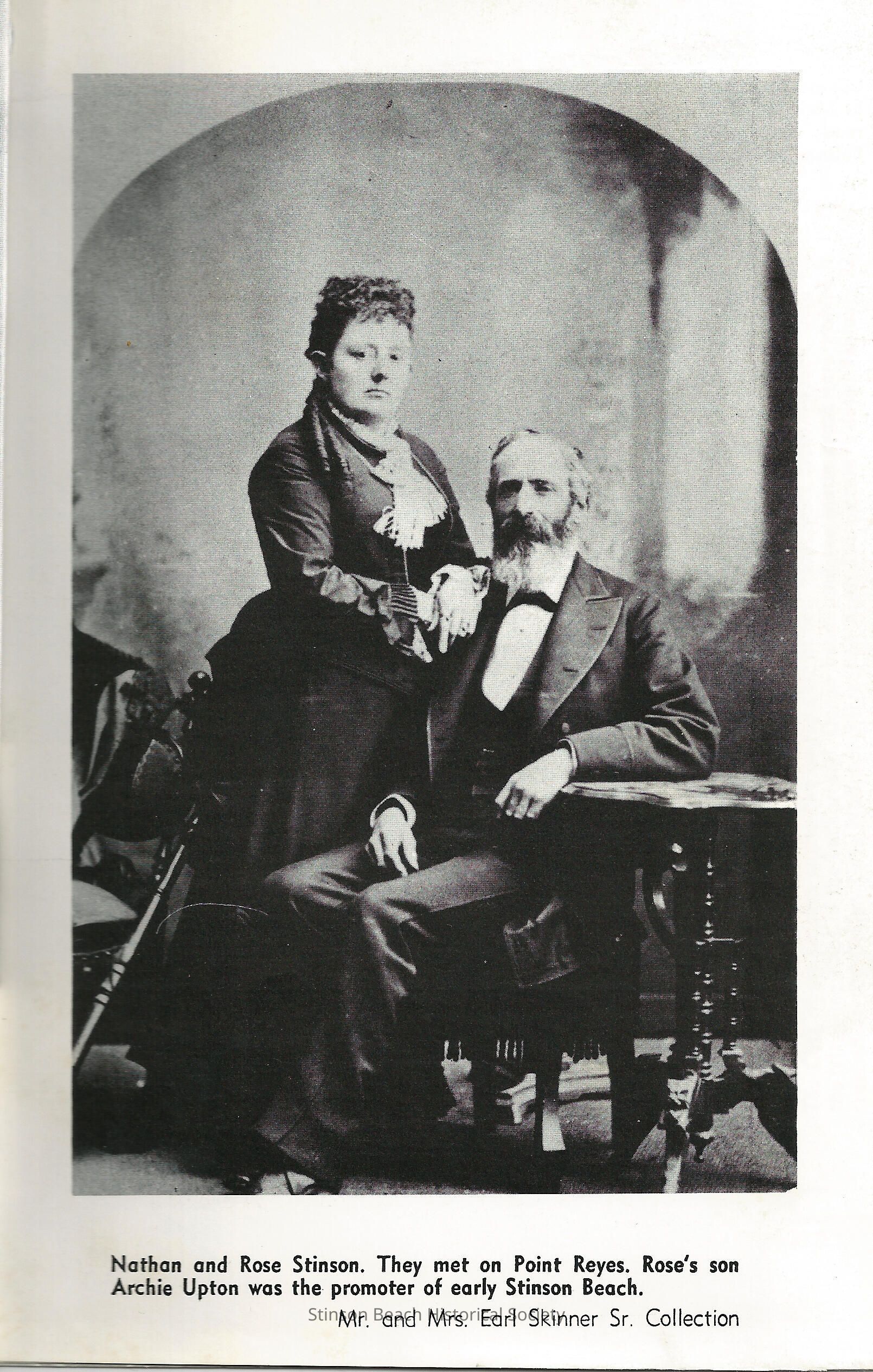This is a digital photograph of Nathan and Rose Stinson taken from page 137 of a book by Jack Mason in 1973, titled "The Last Stage for Bolinas". Nathan is dressed in a formal attire like tuxedo with a bow tie. He has a long beard. He is seated on a chair with 4,5 inches long truceless, his right arm on his lap and left arm resting on a small round table with turned legs. Rose is standing to his side to left of the photo. She has her hair done with bangs on her forehead and her long hair is tied in the back once and 2 curls are showing on her shoulder. She is clasping her hands on the back of Nathan's chair closed to his right shoulder. She is wearing a dark floor length dress.Nathan Stinson married the widow of his partner, James Wallace Upton in 1874 becoming the sole owner of 1720 acres Stinson Ranch. This could be their wedding photo. The foot note of the photo says,"Nathan and Rose Stinson. They met on Point Reyes. Rose's son Archie Upton was the promoter of early Stinson Beach. Mr. and Mrs Earl Skinner Sr. Collection.Collection