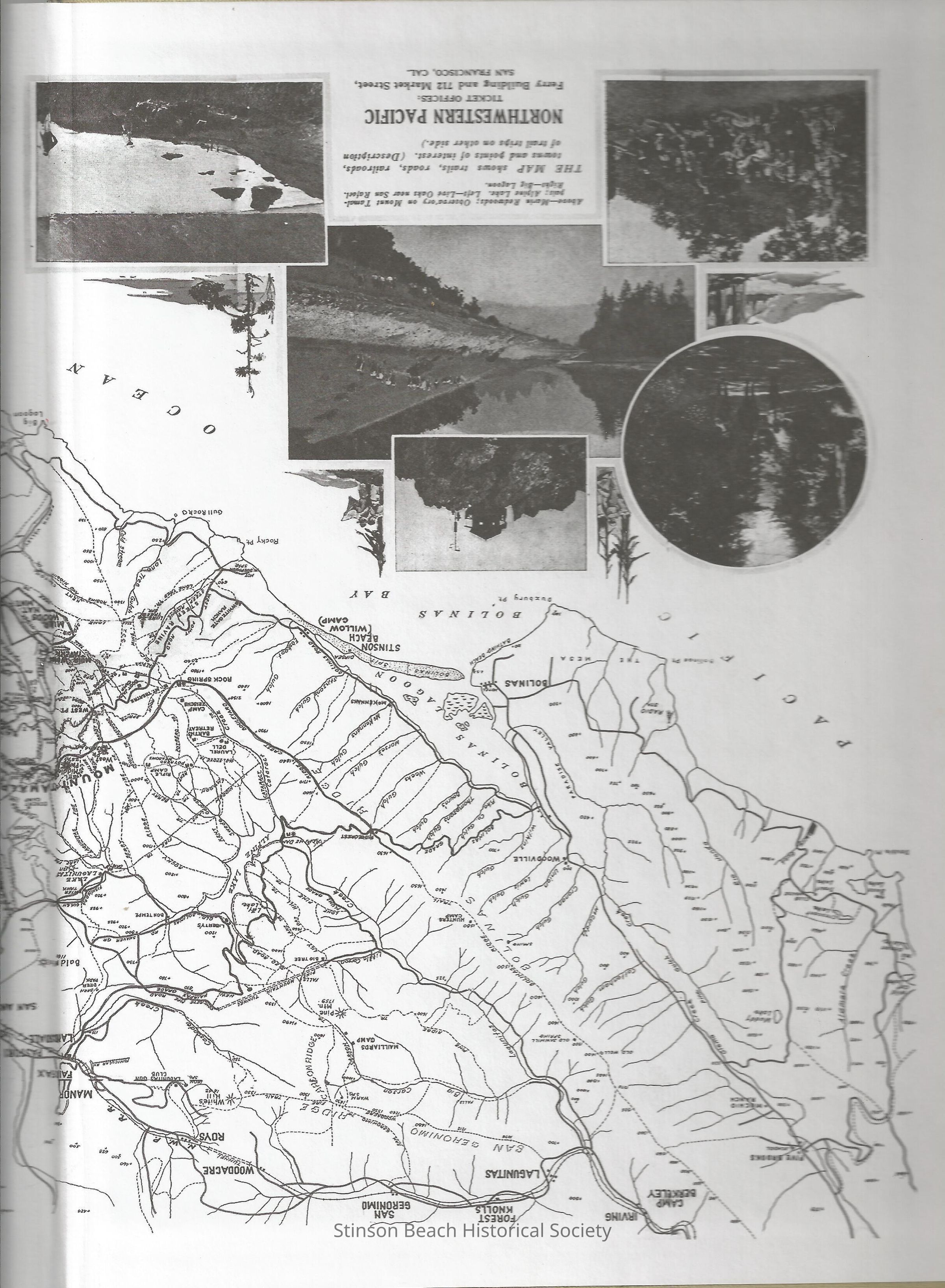 This is a partial photo taken from the inside cover of the book, "Marin A History" written by Barry Spitz. The map was drawn in 1908 showing trails, roads, railroads, towns and points of interest. There are 5 photographs and some illustrations of redwood trees on the lower 1/2 of photo. They are from the left, Marin Redwood, the Mt. Tamalpais Observatory, Alpine Lake, People and Live Oak trees at San Rafael Ridge and Big Lagoon.Collection
