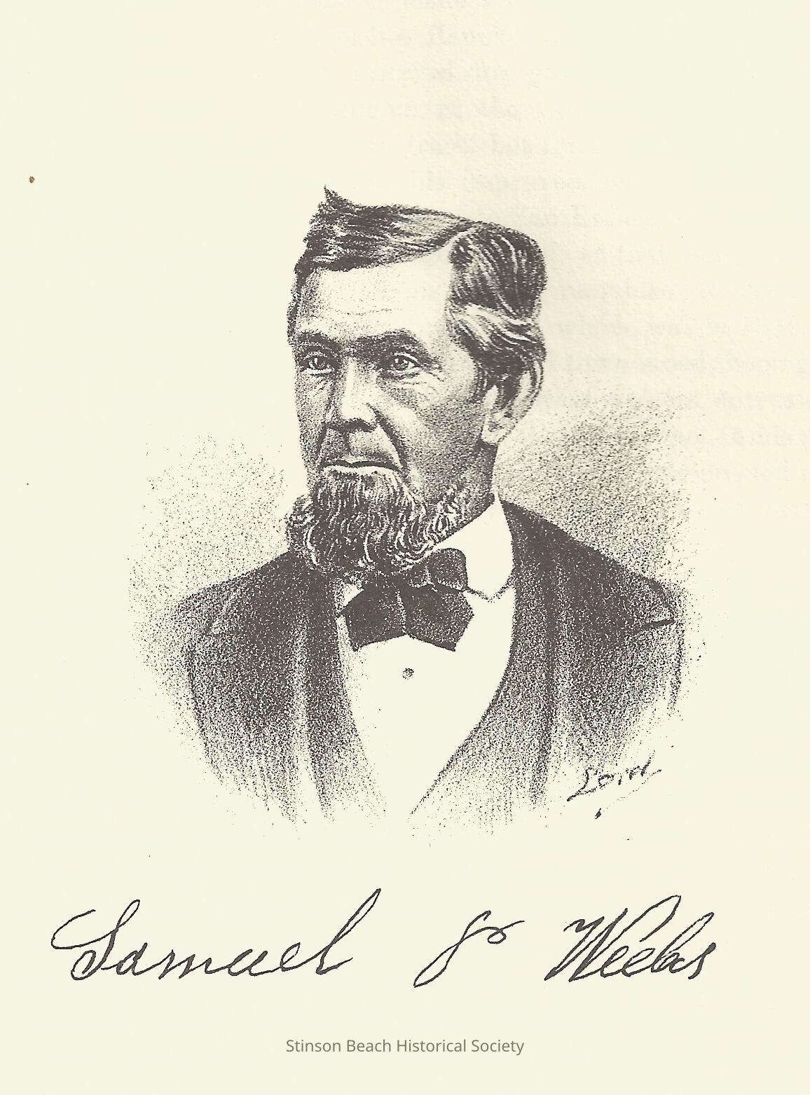 This is a photograph of a drawing of Samuel P. Weeks who owned the Weeks Ranch, last known as the Audubon Volunteer Canyon. Weeks, a Captain of the "Eliza," a Bolinas-San Francisco cargo ship, bought the 150-acre ranch from Briones of Rancho Bolinas in 1865. In this portrait he is a youngish gentleman with short hair and goatee-style beard. He is wearing formal attire with a bow tie. The photograph was taken from J.P.Monro-Fraser's History of Marin County, published on 1880.Collection