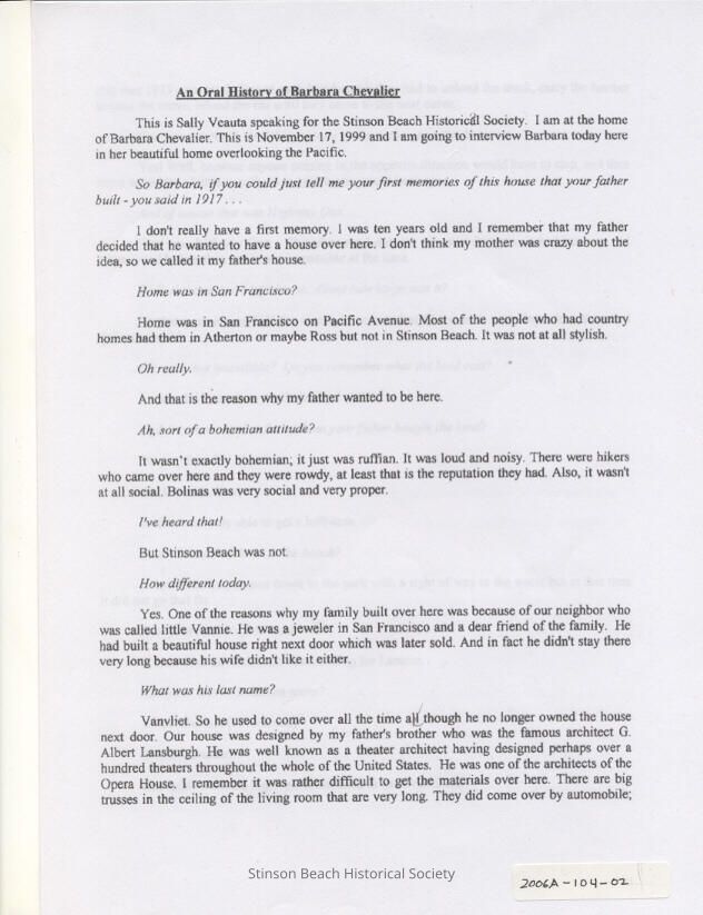 Barbara remembers Stinson Beach from 1927 to 1999. She speaks of her father building the original house, its history and the social scene on weekends when she was a child. She recalls early modes of transportation to Stinson and her childhood animals - cow, horse, dogs. She describes the famous garden on the estate and the equally famous guests at their parties in the 1930-40s. She mentions the fire in 1997 and its aftermath.Collection