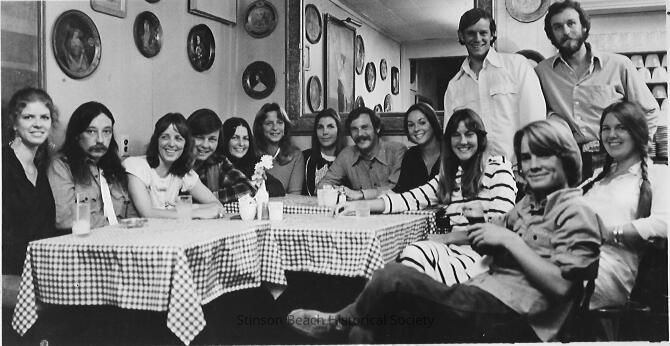 The Sand Dollar staff sit around tables grouped together in the restaurant. Mostly all smiling.