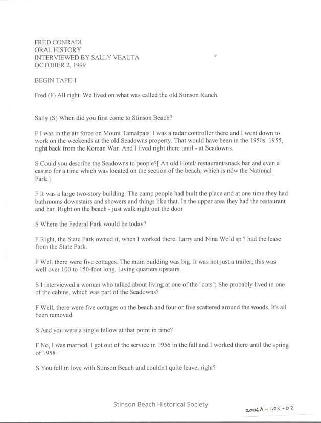 Fred remembers Stinson Beach from 1955 to 1999 when he first arrived in town while serving in the Air Force on Mt. Tam and lived at Seadowns. He later moved to Stinson Ranch, owned by Water District, where there were cattle until the Park Service purchased the property in 1974 - and White Gate Ranch owned by George Leonard. He talks of his kids and the early '60s and remembers the old Sand Dollar, the Pelican's Nest and Seadowns cabins. He has thoughts about the changing times and people and tells of the work he did as carpenter.