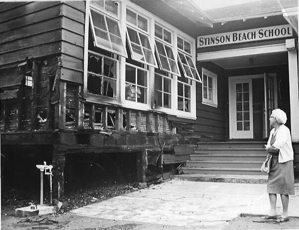 An elderly woman with white hair, with her arms folded and holding her purse, stands outside the Stinson Beach School surveying the aftermath of the fire. Only one window is broken and the others are open at the top. The school door is open and undamaged, but the corner of the building has gaping holes from fire. A drinking fountain sits at the corner of the building.Collection