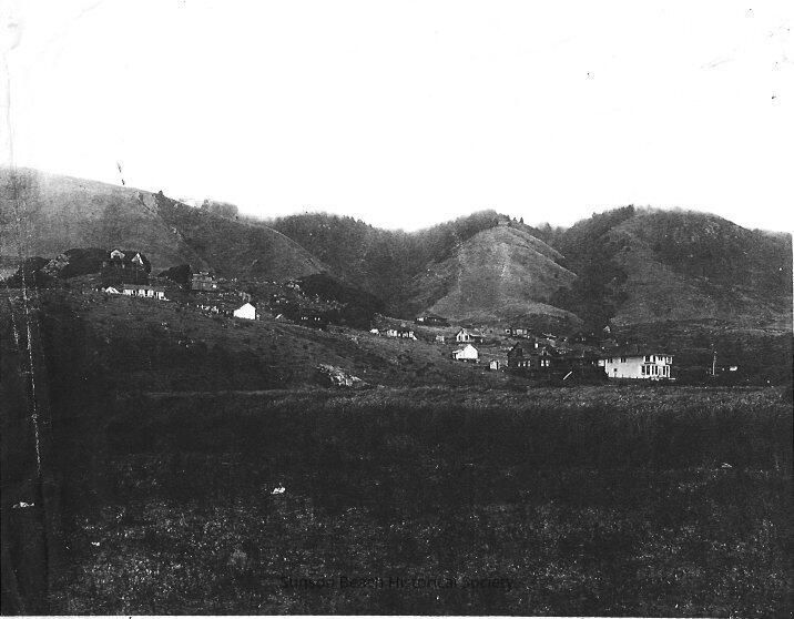 What Stinson Beach looked like around 1915. Airey's Store and the large house behind it are the most prominent structures (on the right) and several other houses and barnlike structures dot the hillside.Collection