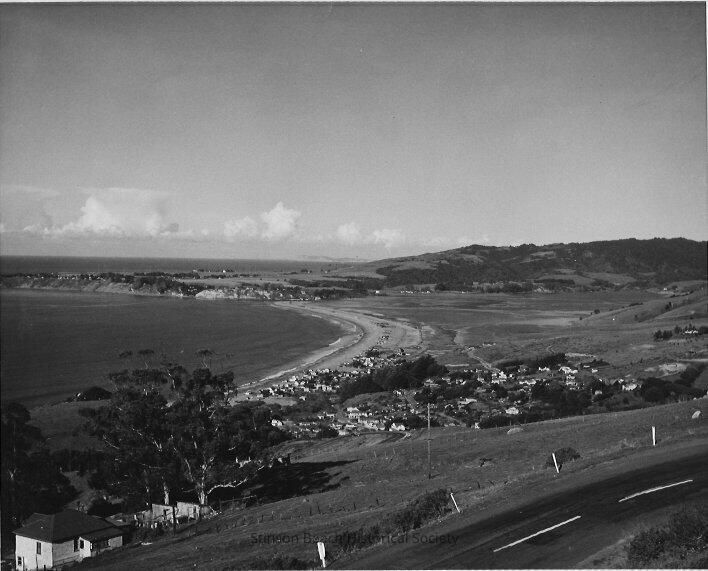 Bolinas Bay Panorama taken from Panoramic Highway above White Gate Ranch, visible bottom left. View extends over town, beach, a relatively undeveloped Seadrift, a flat BolinasLagoon, Bolinas cliffs and Mesa, with Point Reyes Headlands faint in the distance, and band of white clouds on the horizon.Collection