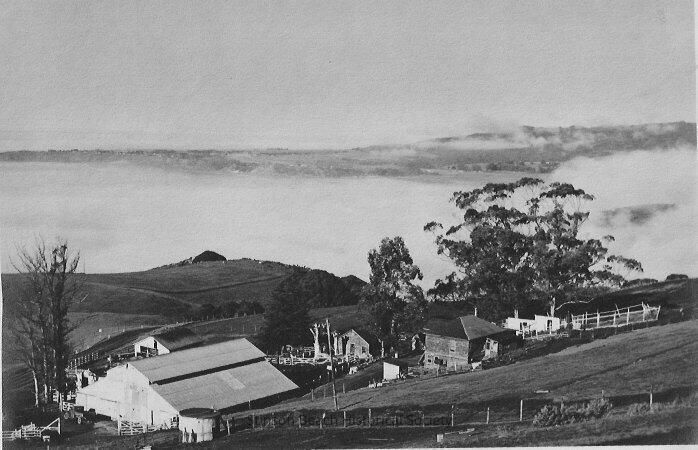 Looking down on White Gate Ranch buildings from higher on the hillside. Large barn on bottom left has a trio of other buildings to the right of it - 2 lower and a residential looking on opposite. To the right of that are a couple of trees and 2 small white structures and pen. The property is set off by a running fence with a water tank on the hill above the big barn. The hillside dotted with fencing following the contours of the hills and along the road. Everything beyond the ranch is obscured by fog with just a hint of Bolinas Mesa in the distance.Collection